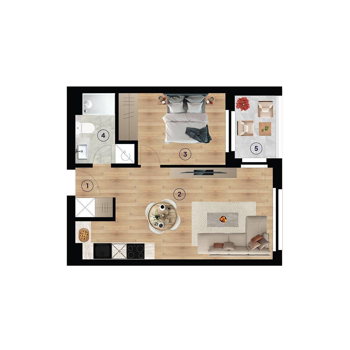 Dvosoban apartman 2. kat A208P površine 43.32m2 u novogradnji, na lokaciji Utinjska 2A, Sveta Klara u Novom Zagrebu.